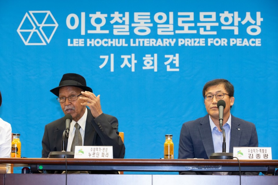 기자회견 중인 누르딘파라, 김종광 작가 Nuruddin Farah and Kim Chong-kwang at the 3rd Lee Hochul Literary Prize for Peace press conference