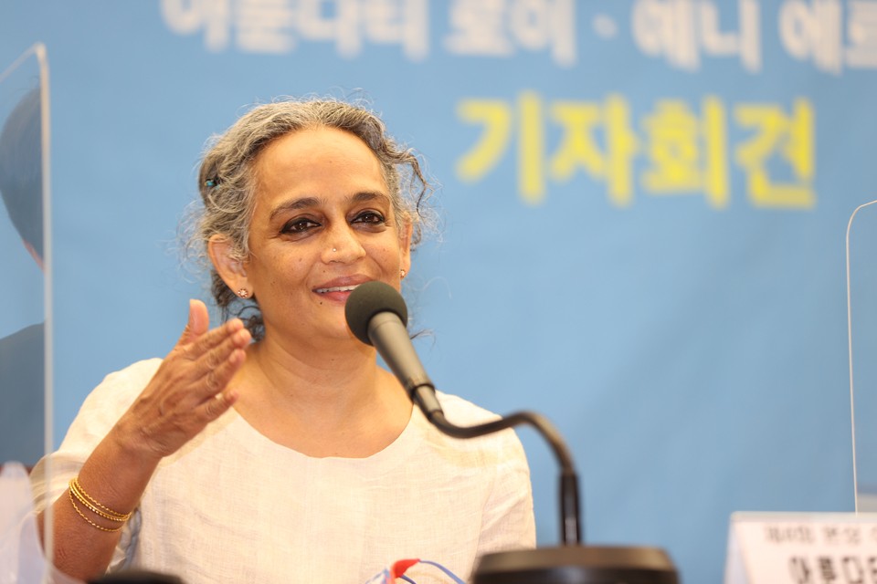 기자회견 중인 제4회 수상작가 아룬다티 로이 Arundhati Roy, the Grand Laureate of the 4th LLPP, during a Press Conference